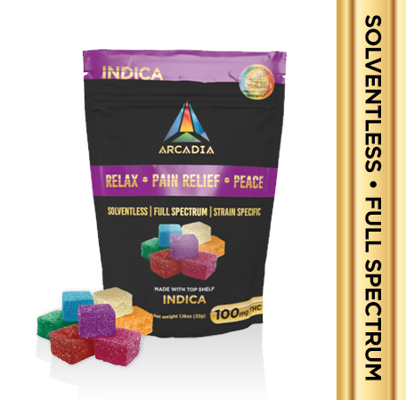 Arcadia Brands' is made with all natural True Solventless, Full Spectrum, Strain Specific. The process is a craft process, using only quality flower that's heat pressed (NO GASES OR CHEMICALS USED IN EXTRACTION), decarbed, and then meticulously measured and mixed into strain specific edibles. Feel the Full Spectrum power of all the Cannabinoids and Terpenes that come with Each Strain.
